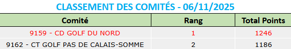 Vous trouverez ci-après les différents classements (au 06/11/2025) :
